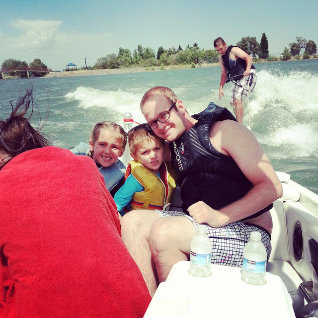Yesterday, we joined the Spicer's as they drug out the boat for the first time this summer season, thus Baby Spice's first of many boat trips. The weather stayed true to Idaho, as we experienced an array of cold, hot, and warm temperatures. The only constant temperature was that of the ice, cold water! The varying degrees didn't seem to put a damper on the day, as we stayed from morning until evening riding in the boat, building sandcastles, surfing the wake, and tubing 'til our tummies hurt. We know that it was a successful day of boating when we finished the night lathering up in Aloe Vera to relieve our sun kissed, or more likely sunburnt, skin.